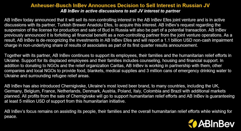 In den letzten Wochen hatte es international zunehmend Kritik an AB Inbev gegeben; unter anderem landete der Konzern auf einer Art List of Shame der renommierten Yale-Universität. Da half es auch nichts, dass AB Inbev zeitgleich seine ukrainische Marke Chernigivske für die Märkte Polen, Italien, Deutschland, Österreich, Dänemark und Finnland quasi in Lizenz in Belgien und bei Beck & Co einbraut, den Profit aus dem Verkauf der 0,5-Liter-Dosen an Hilfsorganisationen (u.a. Caritas) weiterleitet und eine Mindestsumme von umgerechnet 4,5 Mio Euro garantiert.