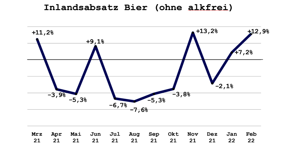Damit liegt die deutsche Brauwirtschaft damit in diesem Februar immer noch rund 600.000 hl unter Niveau Februar 2020 direkt vor dem Inkrafttreten der Corona-Maßnahmen.