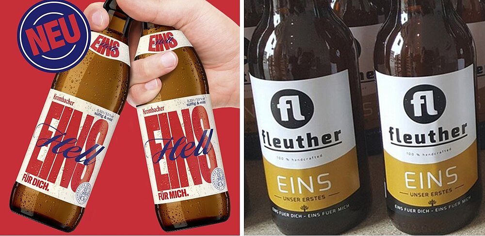Krombacher bringt ab 20.3. in NRW sein neues EINS Hell (INSIDE 916) mit großer Kampagne an den Start und nutzt dabei tatsächlich den Namen und den Slogan, den Fleuther seit 2016 verwendet. Fleuther hatte die Marke EINS nie eingetragen - das taten dann die Kreuztaler im Juli 2022.