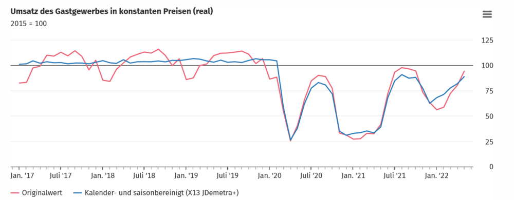 Das Gastgewerbe in Deutschland hat seinen Umsatz im Mai 2022 gegenüber April 2022 kalender- und saisonbereinigt real (preisbereinigt) um 8,5 % und nominal (nicht preisbereinigt) um 9,8 % gesteigert. Gegenüber Mai 2021 hat sich der reale Umsatz mehr als verdoppelt (+126,8 %). Laut Statistischem Bundesamt lag der Gastgewerbeumsatz im Mai allerdings real noch 14,9 % unter dem Niveau des letzten Vor-Corona-Monats Februar 2020. Der Vergleich zu Mai 2019 fällt deutlicher aus: Seinerzeit lag das Gastgewerbe 9,7 Punkte über dem 100er-Wert von 2015, jetzt bei 94,2 Punkten (siehe Grafik)