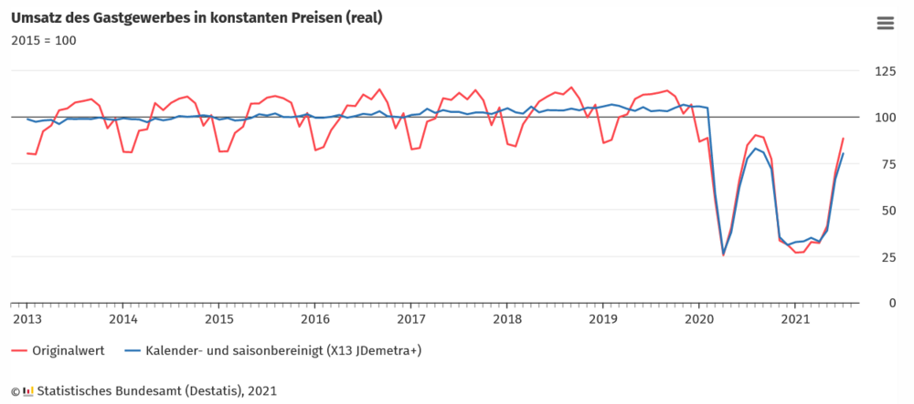 Der Gastgewerbeumsatz in Deutschland ist laut aktuellen Berechnungen des Statistischen Bundesamtes im Juli 2021 um 20,8 % gegenüber Juni (real; nominal + 21.3 %) gestiegen; er lag damit aber immer noch 23,5 % "unter Vorkrisenniveau", in der Lesart des Bundesamtes der Februar 2020. Gegenüber Juli 2020 stieg der Umsatz 3,5 % real (+3,8 % nominal).