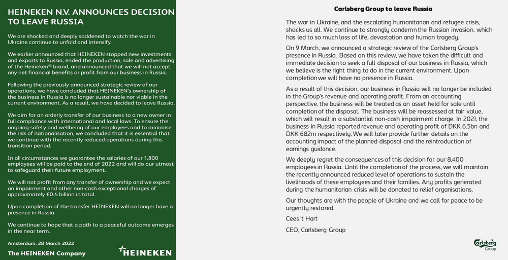 Die Ankündigung ist nahezu wortgleich mit der von Carlsberg: Man strebe eine geordnete Übergabe des Betriebs an einen neuen Eigentümer an, so Heineken. Die 1800 Mitarbeiter in Russland sollen bis zum Jahresende weiterbezahlt werden. Aus dem Verkauf des Russland-Geschäfts wolle man keinen Gewinn erzielen. Man rechne stattdessen mit einem Buch-Verlust von rund 400 Millionen Euro. Ob der Verkauf vollzogen werden kann, ist noch unklar. Unlängst hatte es in der russichen Führung Stimmen gegeben, die forderten auf den Rückzug der internationalen Konzerne mit Enteigungen von deren Produktionsanlagen zu reagieren.