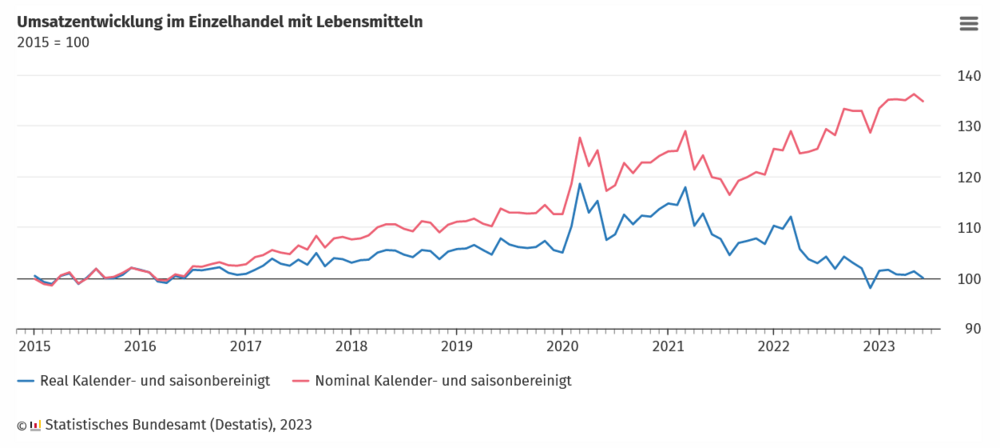 Der Einzelhandel mit Lebensmitteln surft weiter auf einer paradoxen Welle: Weil die Preise für Lebensmittel mit dem Ausklingen der Corona-Phase und auch seit dem Beginn des Überfalls der Russen auf die Ukraine stark gestiegen sind, geht der reale Umsatz mit Lebensmitteln immer weiter zurück. Zeitgleich aber steigt der nominale Umsatz beachtlich. Die Schere wird immer größer.