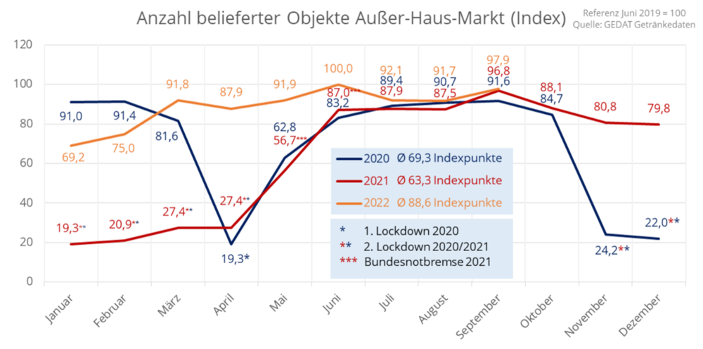 Die Stoppzahlen des GFGH in der Gastronomie haben sich laut Gedat im September 2022 gegenüber August um 5,6 Zähler erholt und stehen steht jetzt bei 97,9 Indexpunkten - also bald schon wieder auf dem Leven 100 von Juni 2022, dem Referenzwert von Juni 2019. Damit ist Vorcorona-Niveau praktisch wieder hergestellt. Im Zuge der Pandemie lag der Wert an seinem tiefsten Punkt im Januar 2021 bei nur noch 19,3 Punkten.