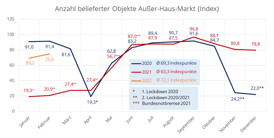 Das Jahr 2021 lag im Mittel bei 63,3 Indexpunkten, im Jahr 2020 waren es noch 69,3 Punkte. Das Jahr 2022 liegt in den ersten beiden Monaten im Durchschnitt bei einem Index von 72,1. Basis der Erhebung war laut Gedat die Anzahl der monatlich belieferten Betriebe im Außer-Haus-Markt durch den Getränkefachgroßhandel. Die Vergleichswerte beziehen sich auf Juni 2019 mit einem Index von 100.