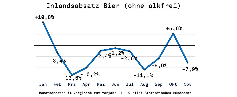 Für die deutschen Brauer und Bierlager war es ein Monat zum Verzweifeln: Im November verkauften sie laut Statistischem Bundesamt 8,6 % weniger Bier als noch im Vorjahresmonat, allein in Deutschland betrug der Verlust -7,9 %. Aufgelaufen steht die Branche damit bei -4,2 % bzw. -4,0 % (alle Zahlen ohne alkoholfreie Biere).