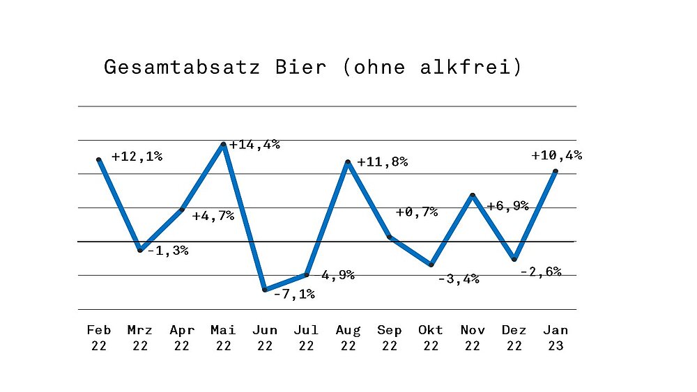 Der erste Januar ohne Corona-Einschränkungen seit drei Jahren ist für die deutschen Brauer und Bierlager ernüchternd verlaufen: Zwar steht gegenüber 2022 (alkholfreie Biere ausgeschlossen) laut Statistischem Bundesamt mit 5,643 Mio hl ein Plus von satten 10,4%. Das Inland mit 4,589 Mio hl liegt 10,8% vorn, der Export mit 1,054 Mio hl schreibt +8,8% (EU: +6,9%; Drittländer: +9,9%).